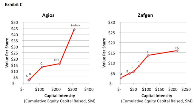 Agios is the archetypal big biology platform play, led in large part by Third Rock Ventures. They initially raised a $33M Series A round, tranched (if I’m not mistaken), at $2.73 per share (split adjusted). This created enough scientific progress to lock in a landmark Celgene deal, bringing $120M in largely non-dilutive funding (and some Series B equity). This deal drove the momentum to raise the $75M+ Series C at $13.50 per share, a handsome step-up in value, in 2011. Then it went public, raising $106M more, at $18.00 per share, and is now trading at $37 (as of this blog’s writing). If equity capital intensity was your only metric for efficiency, you’d conclude that Agios has raised ~$300M in equity and therefore must not be capital efficient. I’d argue strongly otherwise: Agios was incredibly equity capital efficient because it was able to continually improve its cost-of-capital as it ratcheted up its capital intensity.