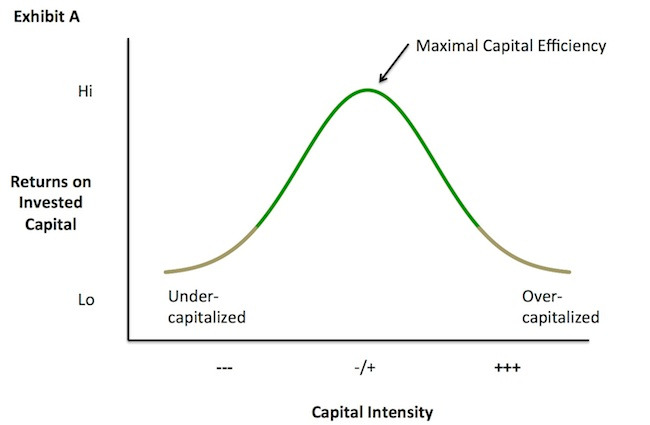 For us, the proper definition of equity capital efficiency is that sweetspot where the most amount of value is generated per unit dollar invested, as depicted in Exhibit A below. Optimal equity capital efficiency is that point on the curve where returns on invested capital for a given deal reach their peak. Over-capitalizing a company (funding it more than it needs) will result in decreased returns (the right side of the curve). Under-capitalizing a company (funding it too little) will starve a business and also result in decreased returns.