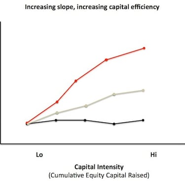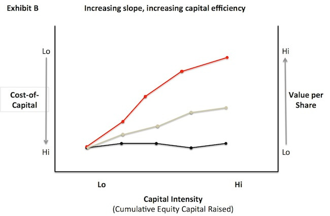As shown in Exhibit B below, with capital intensity plotted vs. the cost-of-capital, companies that traverse lines over time with higher slopes reflect higher levels of capital efficiency. For example, the “black-line” is a biotech that raises more and more capital but does so at essentially the same high cost of capital – reflecting an inefficient use of equity capital (for the early investors, certainly). Biotechs that are able to throttle up and hit the “red-line” are ones that raise money at consistently higher valuations, thus demonstrating a nicely efficient use of equity capital along the way.
