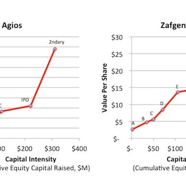 A recent IPO from our (and TRV’s) portfolio, Zafgen, is another example, albeit of a more focused approach: Zafgen has been interrogating the role of a single pathway (metAP2) in obesity. We raised five preferred stock series before the IPO: the Series A was $2.63 per share, B was $4.74, C was $5.69, D was $8.53, E was $13.64, IPO at $16 and is trading above $18 right now. We’ve raised over $200M to date, but with a nice upward appreciation of the stock price over time. Moving a drug program into multiple clinical trials and hundreds of patients is capital intensive – but can also be very capital efficient with strong data in the right market environment.